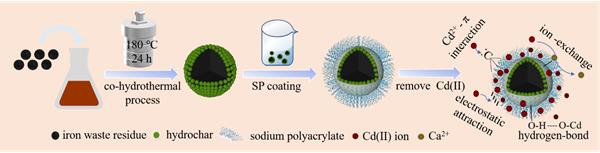 铁基碳微球制备过程及其移除镉Cd(II)的机理图
